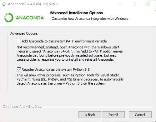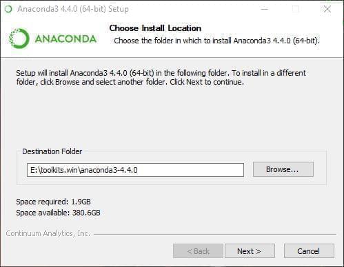 本教程最初使用的是 Python 2.7,而随着 TensorFlow 可作为 Keras 的后端,我们决定使用 Python 3.6 作为默认配置.因此,根据我们配置的偏好,可以设置 e:\toolkits.win\anaconda3-4.4.0 或 e:\toolkits.win\anaconda2-4.4.0 为安装 Anaconda 的文件夹名.