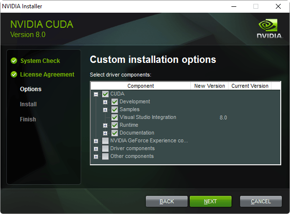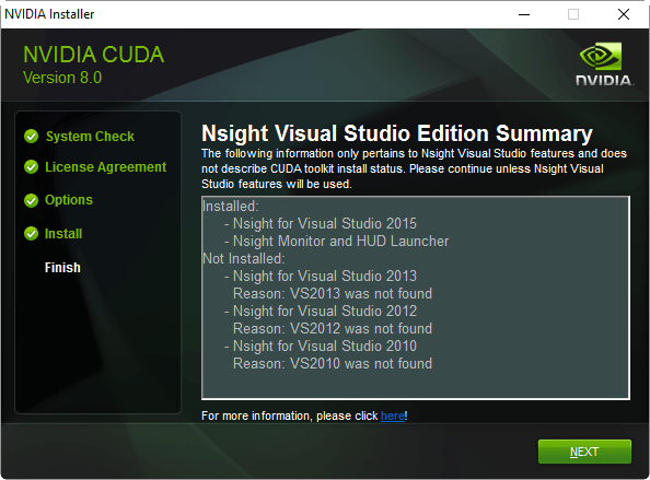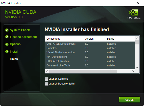 CUDA 8.0.61 (64-bit):CUDA 是一种由 NVIDIA 推出的通用并行计算架构,该架构使 GPU 能够解决复杂的计算问题,该软件包能提供 GPU 数学库、显卡驱动和 CUDA 编译器等.