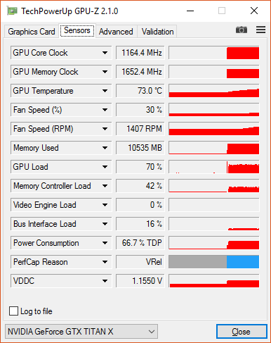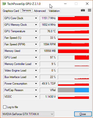 That is quite an improvement over the CPU-only version already. Without cuDNN, each epoch takes about 47s on this particular machine. If you install TechPowerUp’s GPU-Z, you can track how well the GPU is being leveraged. Here, in the case of this convnet (no cuDNN), we max out at 97% GPU usage on average: