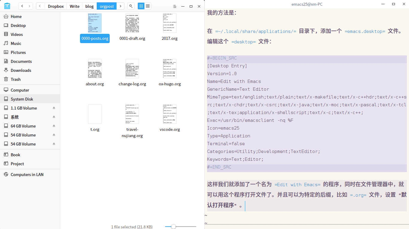 这样我们就添加了一个名为 Edit with Emacs 的程序,同时在文件管理器中,就可以用这个程序打开文件了。并且可以为特定的后缀,比如 .org 文件,设置 默认打开程序 为 Edit with Emacs 。
